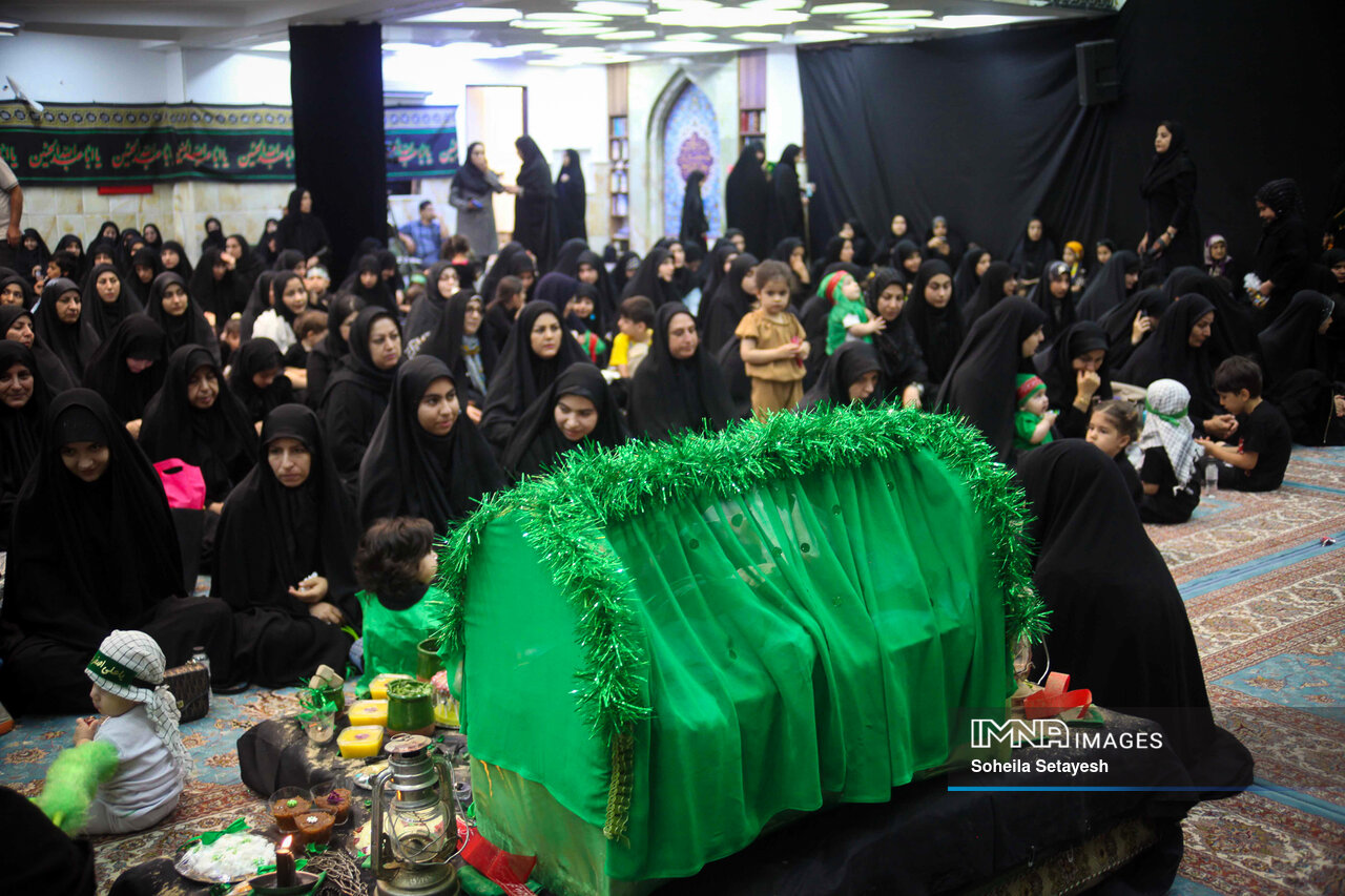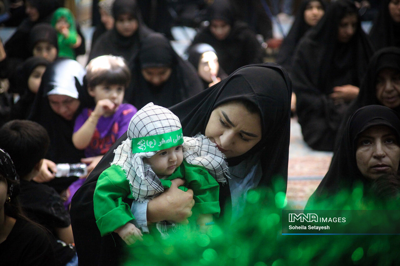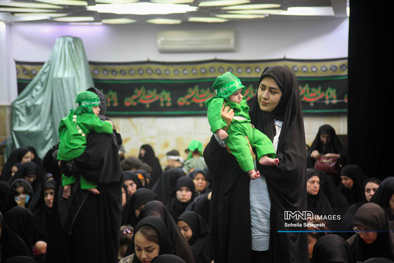 The ritual unfolds over approximately two hours and is structured into four main parts. It begins with a speech by a religious cleric, addressing themes of maternal love, religious devotion, and contemporary social concerns such as women's roles, chastity, and resistance to Western cultural influences. This is followed by the recitation of elegiac poems and lullabies that evoke deep emotional mourning for Ali Asghar. At the peak of the ceremony, mothers lift their infants above their heads, symbolically reenacting Husayn ibn Ali’s act of holding Ali Asghar aloft during the battle, while the sound of a crying baby is played to intensify the atmosphere of sorrow and remembrance.